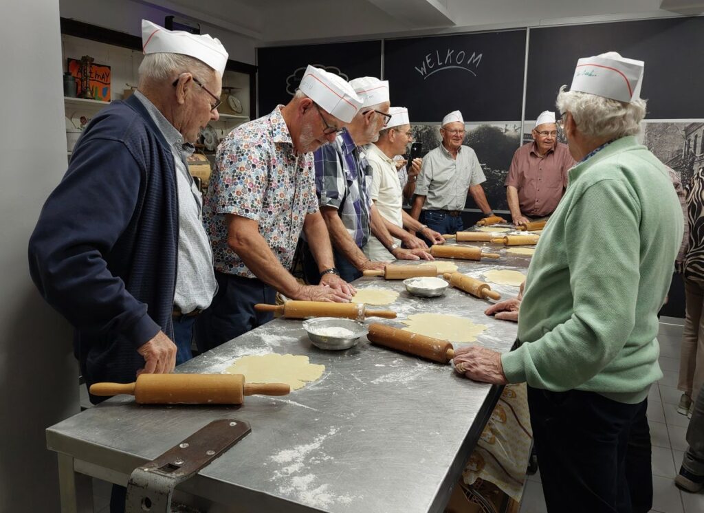 We werden hartelijk ontvangen. Eén helft werd getrakteerd op koffie en een megagroot stuk vlaai. De andere helft moest meteen aan de slag in de bakkerij. Muts op, handen wassen en onder deskundigen leiding aan de slag met een bolletje deeg. Zorgvuldig kneden en uitrollen en daarna werden uit de dunne deeglapjes de ‘hundjes’ gestoken.