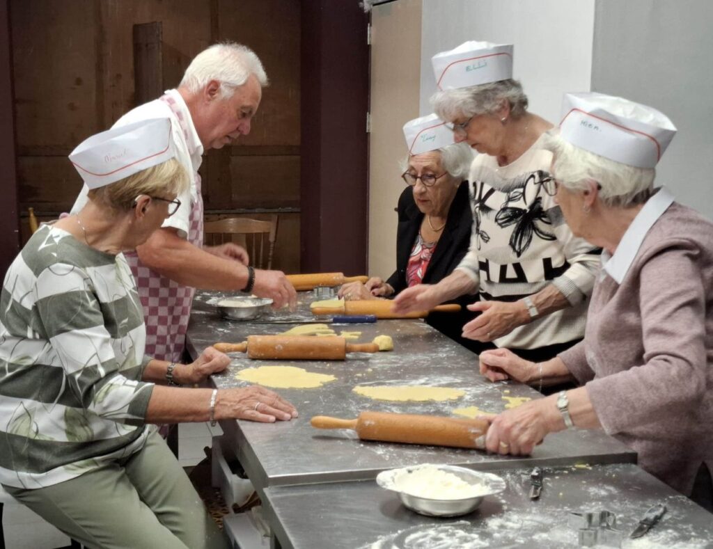 De andere helft had ondertussen van de koffie met vlaai genoten en werd gesplitst in twee groepen. Eén groep kreeg uitleg over de bakkerij en het bakken van weleer. Uit de verhalen bleek dat vroeger in de bakkerij veel handenarbeid werd verricht, het was flink aanpakken. De andere helft kreeg uitleg in de nostalgische winkel. Er werden herinneringen opgehaald. Men dacht met weemoed terug aan de tijd toen men nog wel eens achterom naar binnenging om na sluitingstijd iets te kopen. Tijdens al deze activiteiten kwam de ‘pastoor’ zomaar binnenlopen en hij ging met velen in gesprek. Zo werden de herinneringen aan vervlogen tijden extra duidelijk. Terwijl de pastoor zijn ronde deed lagen de eerste ‘hundjes’ in de oven. De koorleden die hadden geluisterd naar de verhalen konden nu hun bakkerskunsten laten zien. En omgekeerd konden de bakkers genieten van de koffie met vlaai en luisteren naar de uitleg en verhalen over het bakkerijverleden.