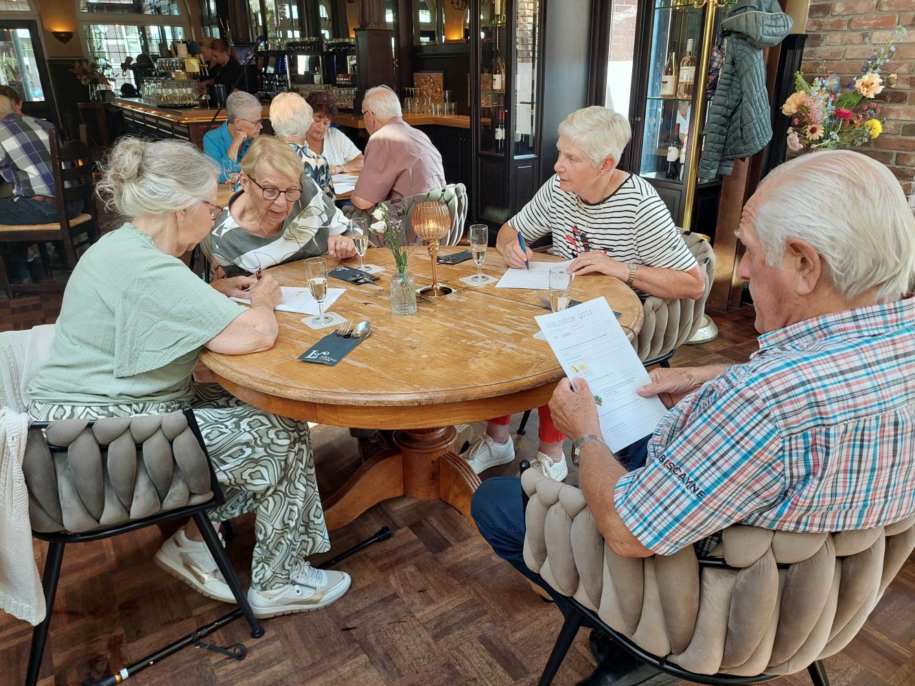 Om half vier sloten we deze activiteit af en wandelden met z’n allen naar ‘Liesbeth’s Grand Café’. Het was het stralend weer. Wederom genieten. We werden bij Liesbeth ontvangen in het zaaltje waar we, los van andere gasten, bij elkaar zaten om ons programma voort te zetten. De nummers die we bij binnenkomst kregen, zorgde voor een verrassende tafelschikking, waarbij je deze keer bij iemand anders aan tafel zat als gebruikelijk. Na het welkomstdrankje werd ons brein in werking gezet d.m.v. een quiz. Per tafel moesten er vragen beantwoord worden over algemene onderwerpen, natuur en over onze zangvereniging. Tijdens het Sharing dinner (iedereen kon eten wat hij/zij het allerlekkerst vond) werd de uitslag bekend gemaakt en kwamen de winnaars uit de bus. Voor de niet winnaars was er een troostprijs. Iedereen ging met een voldaan gevoel, een tevreden glimlach en een ervaring rijker huiswaarts.